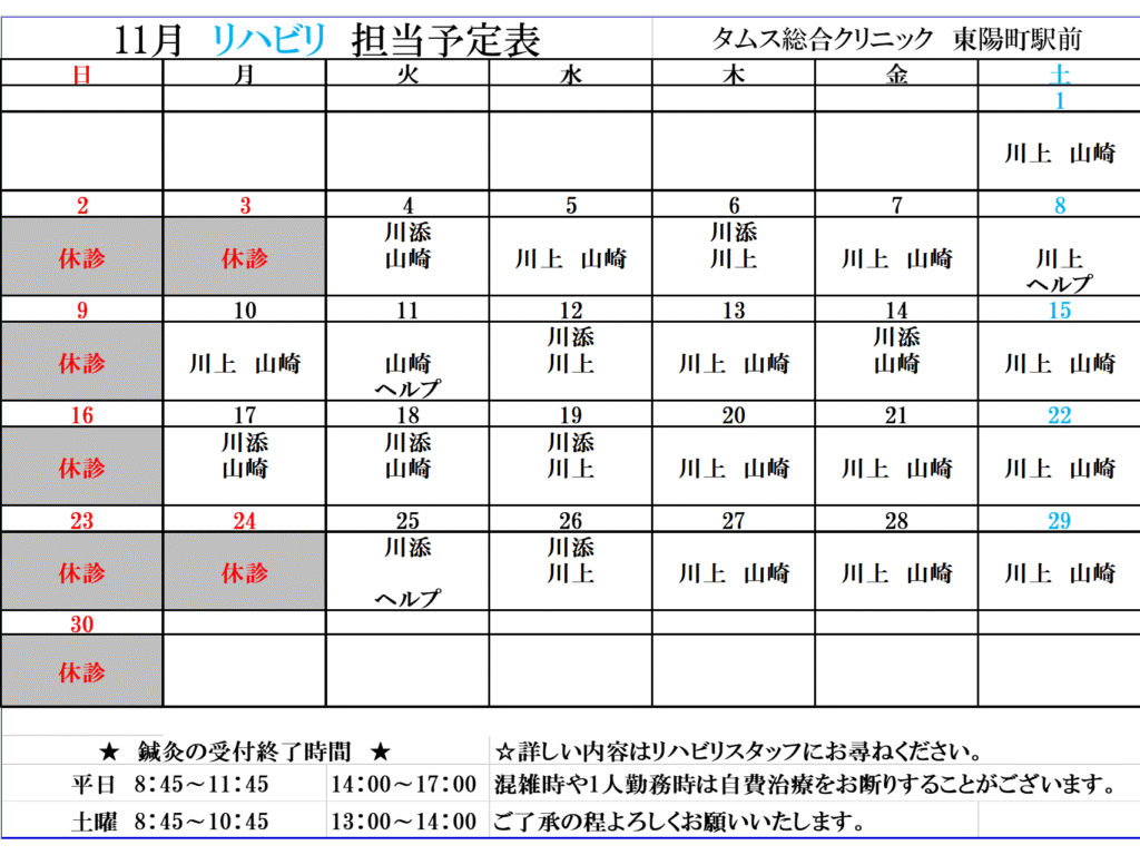 令和7年11月リハビリ担当予定表