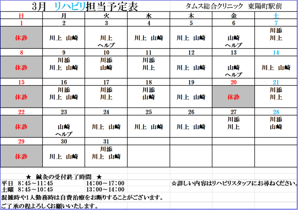 令和8年3月リハビリ担当予定表
