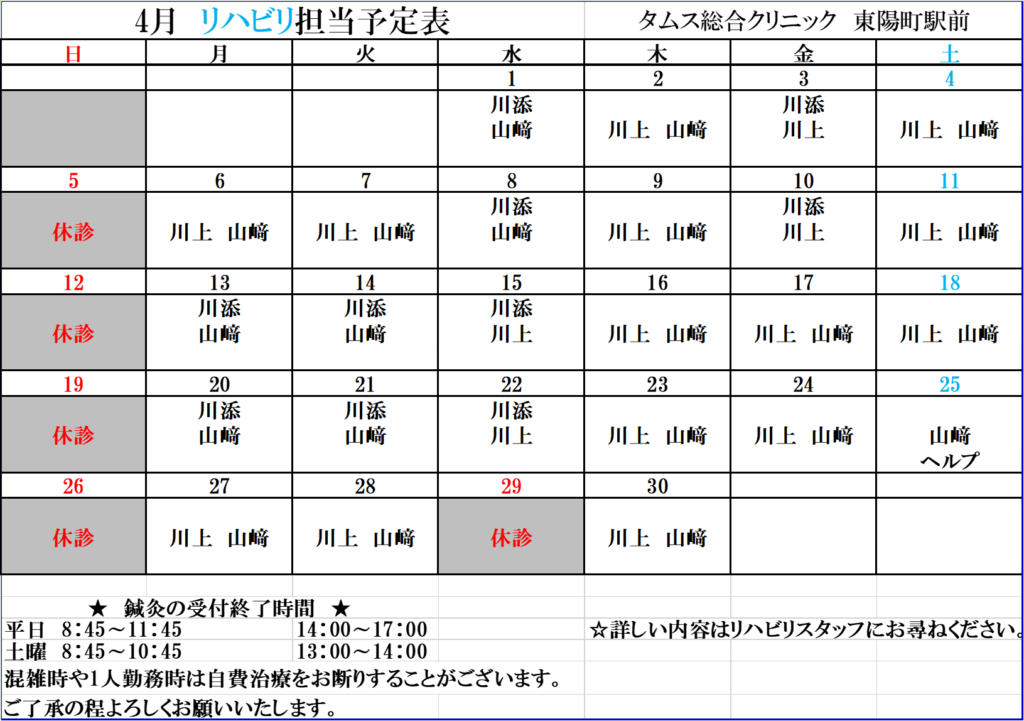 令和8年4月リハビリ担当予定表